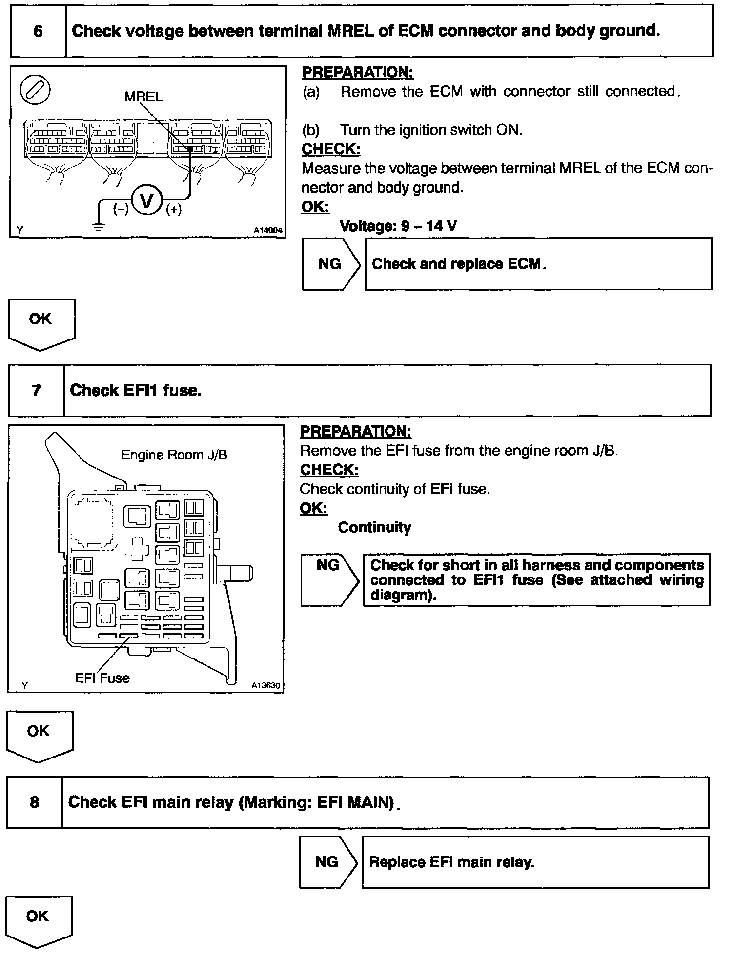 This signal causes current to flow to the coil, closing the contacts of the EFI main relay and supplying power to terminals +B of the ECM.