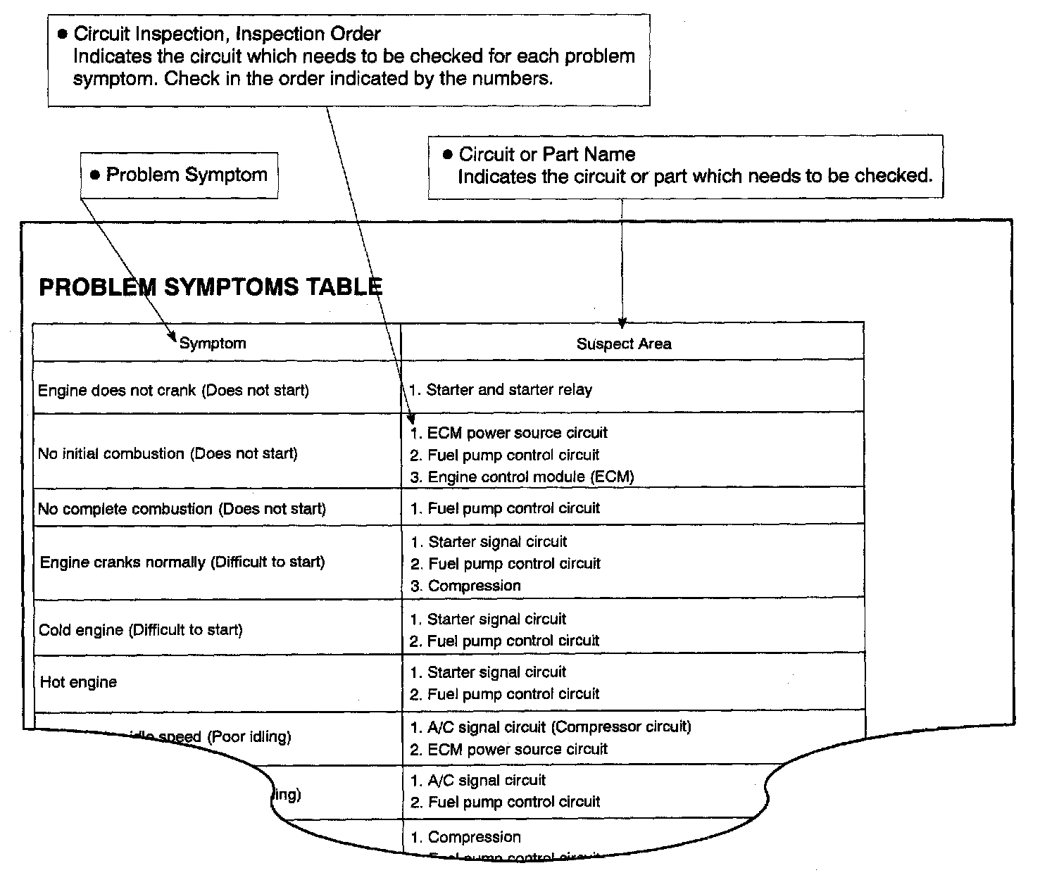 The suspected circuits or parts for each problem symptom are shown in the table. Use this table to troubleshoot the problem when a "Normal" code is displayed in the diagnostic trouble code check but the problem is still occurring. Numbers in the table indicate the inspection order in which the circuits or parts should be checked.
