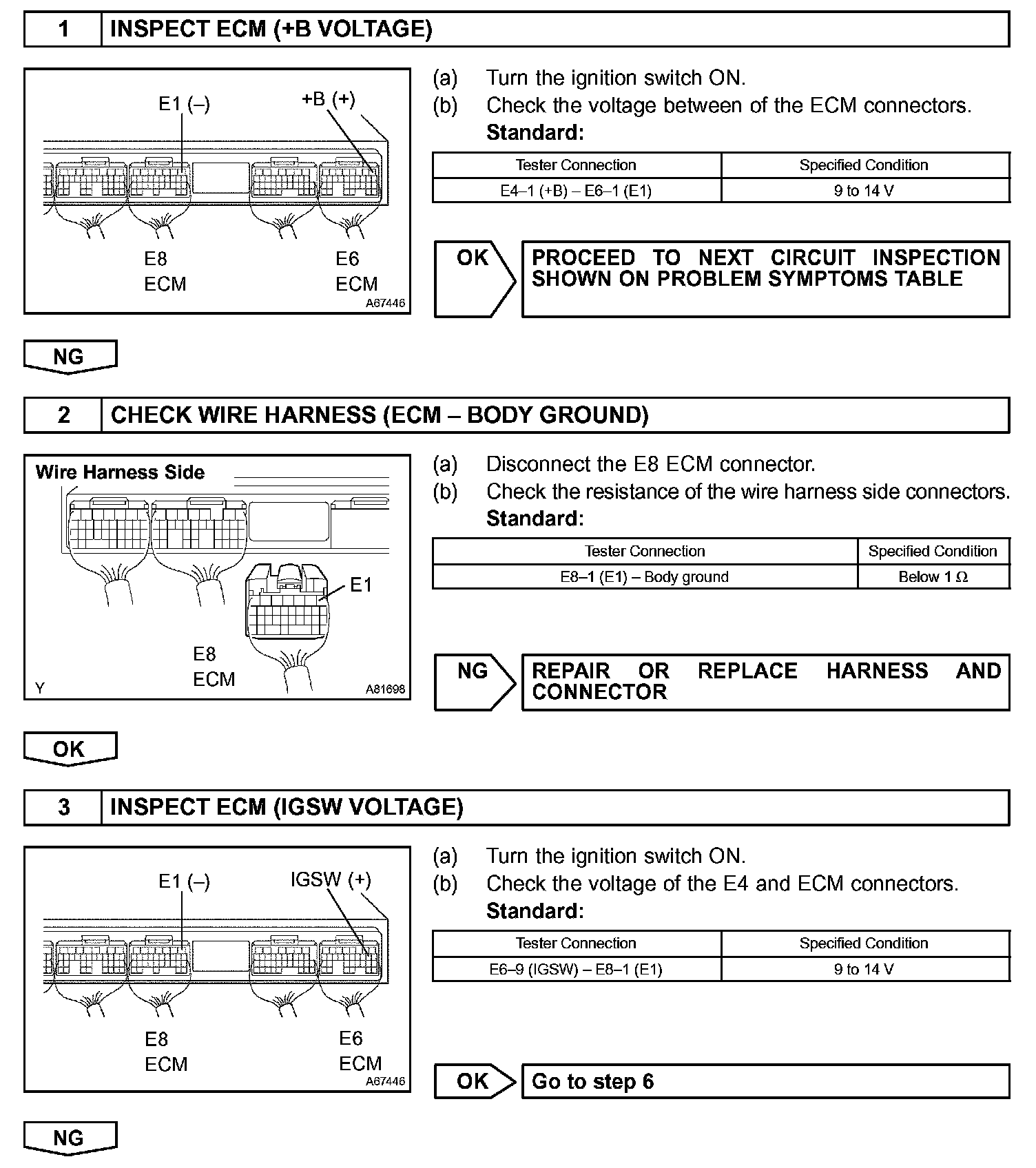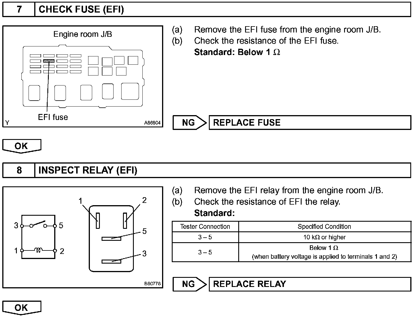 When the ignition switch is turned ON, battery voltage is applied to terminal IGSW of the ECM. The ECM "MREL" output signal causes current to flow to the coil, closing the contacts of the EFI relay (Marked: EFI) and supplying power to terminal +B of the ECM.