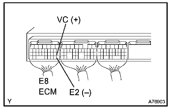 2. Using a voltmeter, measure the voltage between terminals E8 18 (VC) and E8 28 (E2) of the ECM connectors.