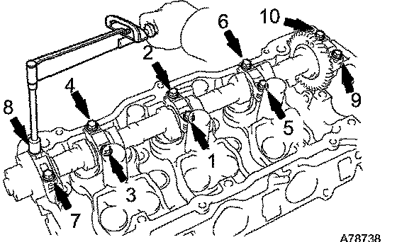f. Uniformly tighten the 10 bearing cap bolts uniformly in the sequence shown in the illustration.