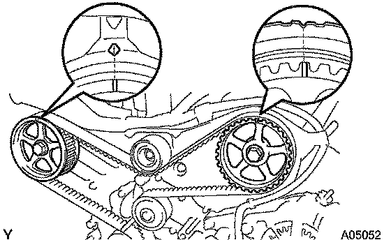j. Align the installation marks on the timing belt with the timing marks of the camshaft timing pulleys.