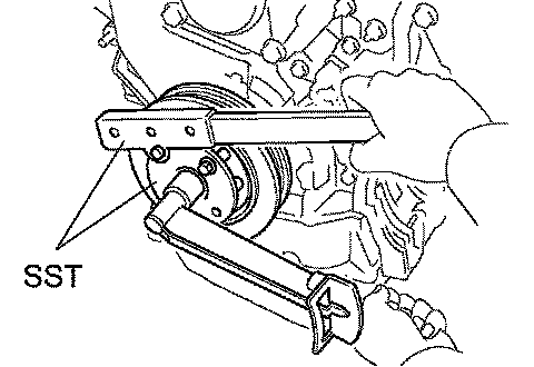 f. Using SST, turn the crankshaft pulley, and align the timing marks of the timing pulley with the No. 3 timing belt cover.