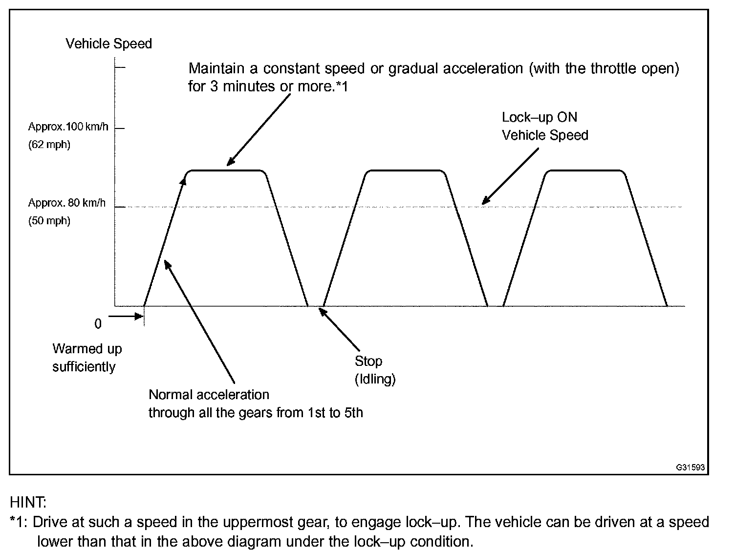 HINT: *1: Drive at such a speed in the uppermost gear, to engage lock-up. The vehicle can be driven at a speed lower than that in the above diagram under the lock-up condition.