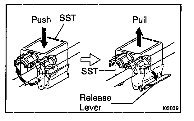3. Pull SST slightly and push the release lever, then remove the piping clamp with SST.