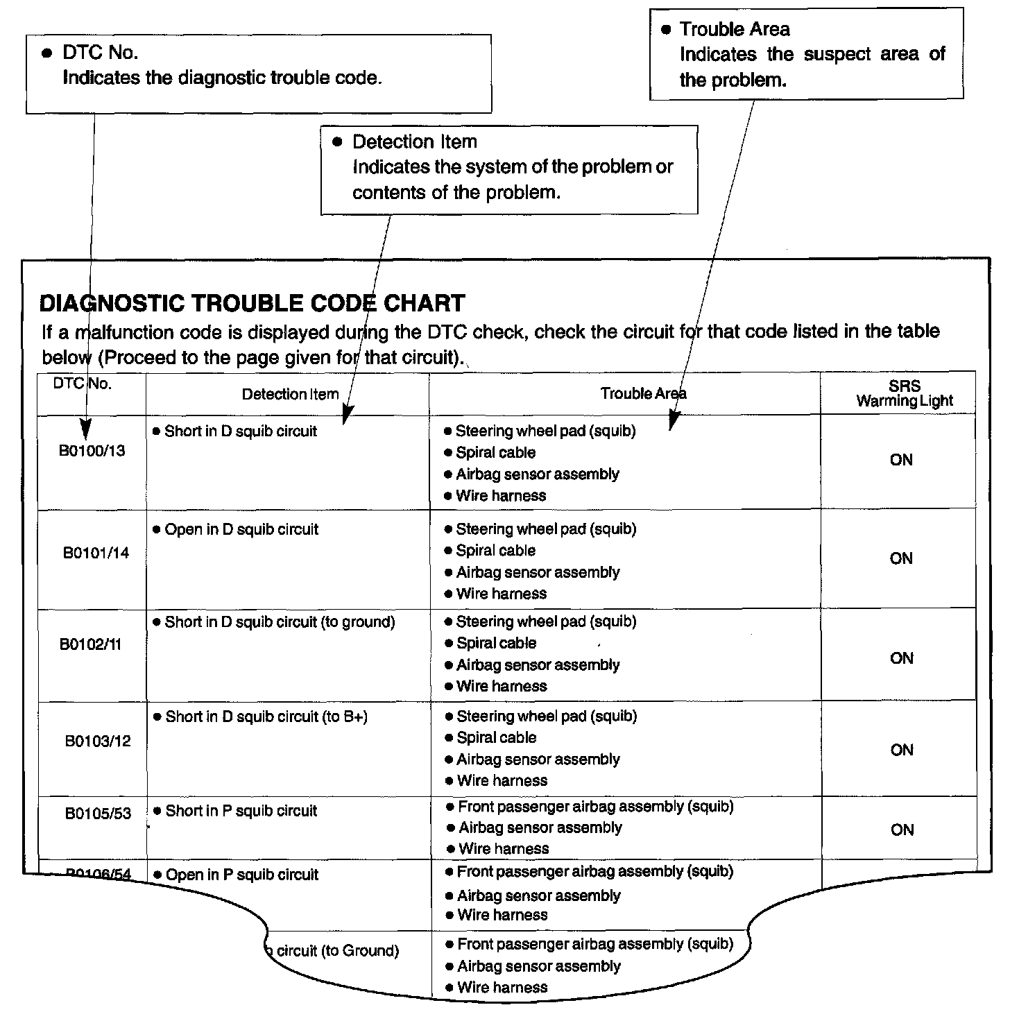 The inspection procedures are shown in the table. This table permits an efficient and accurate troubleshooting using the diagnostic trouble codes displayed in the diagnostic trouble code chart. Proceed with troubleshooting in accordance with the inspection procedures given in the diagnostic chart corresponding to the diagnostic trouble codes displayed. The Supplemental Restraint System diagnostic trouble code chart is shown as an example.