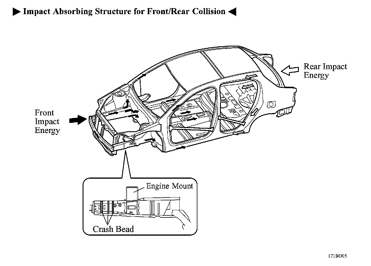 Accordingly, the underbody and cabin framework help to absorb and dissipate the impact energy efficiently in case of a front or rear collision, thus realizing the minimized cabin deformation. Also, rows of crash beads are establish on the front side of the front side members to help absorbing the impact at collision and thus results in providing the structure to hold the body deformation within ahead of the engine mount as much as possible.