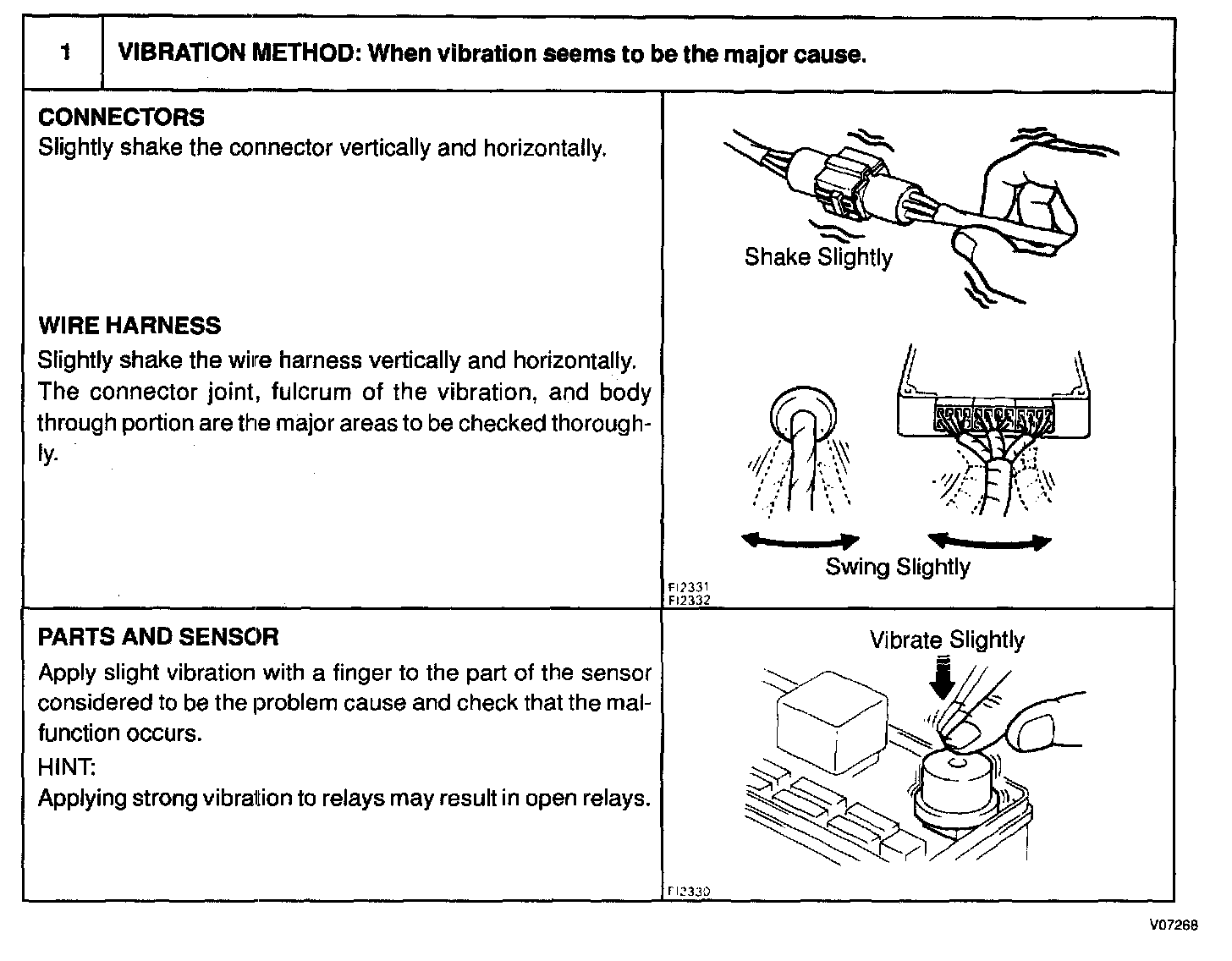 The most difficult case in troubleshooting is when there are no problem symptoms occurring. In such cases, a thorough customer problem analysis must be carried out, then simulate the same or similar conditions and environment in which the problem occurred in the customer's vehicle. No matter how much experience a technician has, or how skilled he may be, if he proceeds to troubleshoot without confirming the problem symptoms he will tend to overlook something important in the repair operation and make a wrong guess somewhere, which will only lead to a standstill. For example, for a problem which only occurs when the engine is cold, or for a problem which occurs due to vibration caused by the road during driving, etc., the problem can never be determined so long as the symptoms are confirmed with the engine hot condition or the vehicle at a standstill. Since vibration, heat or water penetration (moisture) is likely cause for problem which is difficult to reproduce, the symptom simulation tests introduced here are effective measures in that the external causes are applied to the vehicle in a stopped condition.