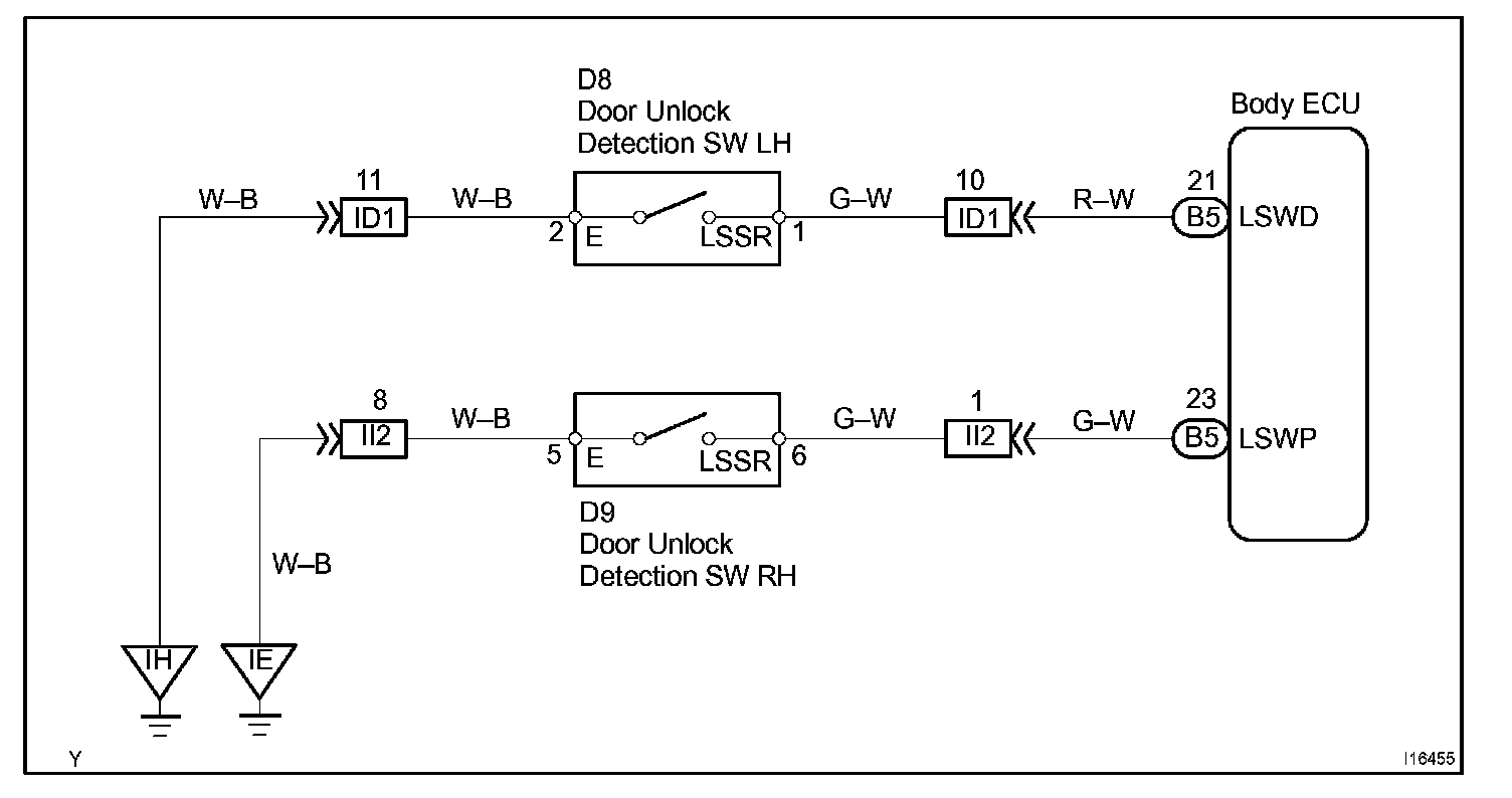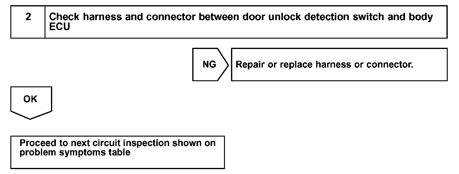 The door unlock detection switch is built in the door lock motor assembly. This switch is ON when the door lock knob is in the unlock position and OFF when the lock knob is in the lock position. The body ECU detects the door lock knob conditions in this circuit. It is used as one of the operating conditions for the key confinement prevention function.