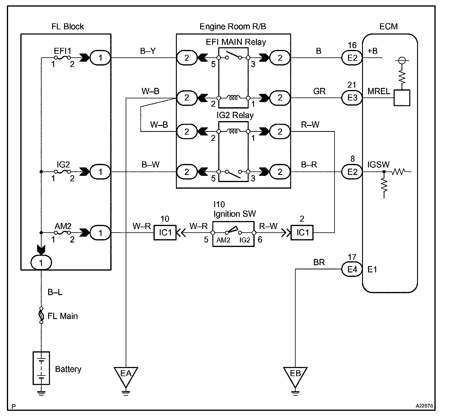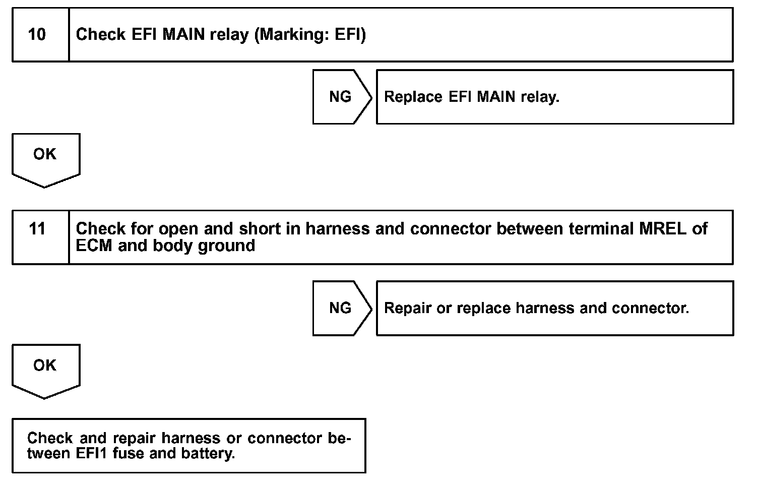 When the ignition switch is turned ON, battery positive voltage is applied to the IG2 relay and terminal IGSW of the ECM. Then the EFI main relay (Marking: EFI MAIN) control circuit in the ECM sends a signal to terminal MREL of the ECM, switching on the EFI main relay.