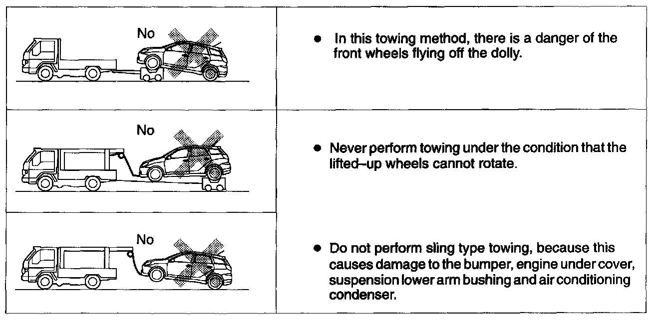 - For example, the towing methods shown are dangerous or damage the vehicle, and therefore do not use them.
