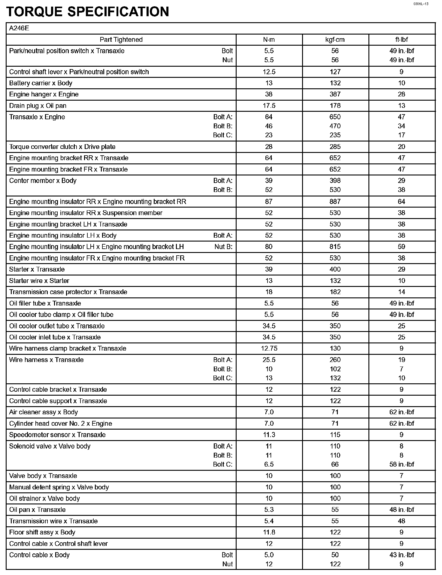 Automatic Transmission/Transaxle - Torque Specification Part 1: