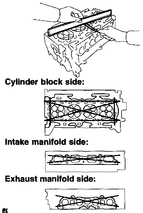 a. Using a precision straight edge and a feeler gauge, measure the surface contacting the cylinder block and the manifolds for warpage.