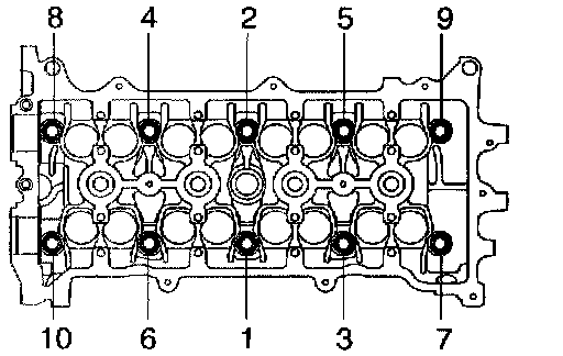 c. Using a bi-hexagon wrench 10, install and uniformly tighten the 10 cylinder head bolts with plate washers, in several passes, in the sequence shown.