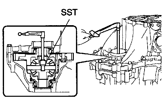 c. Using SST and a torque wrench, turn the differential case assy to the right and left 2 or 3 times to allow the bearings to settle.