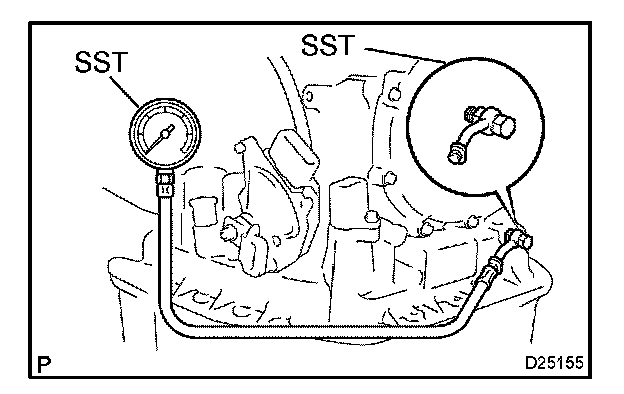 2. Remove the test plug on the transaxle case front left side and connect SST.