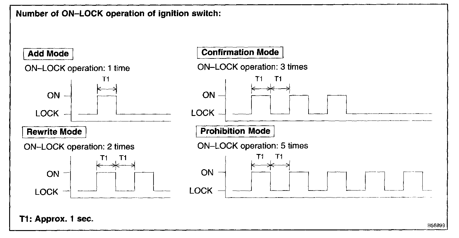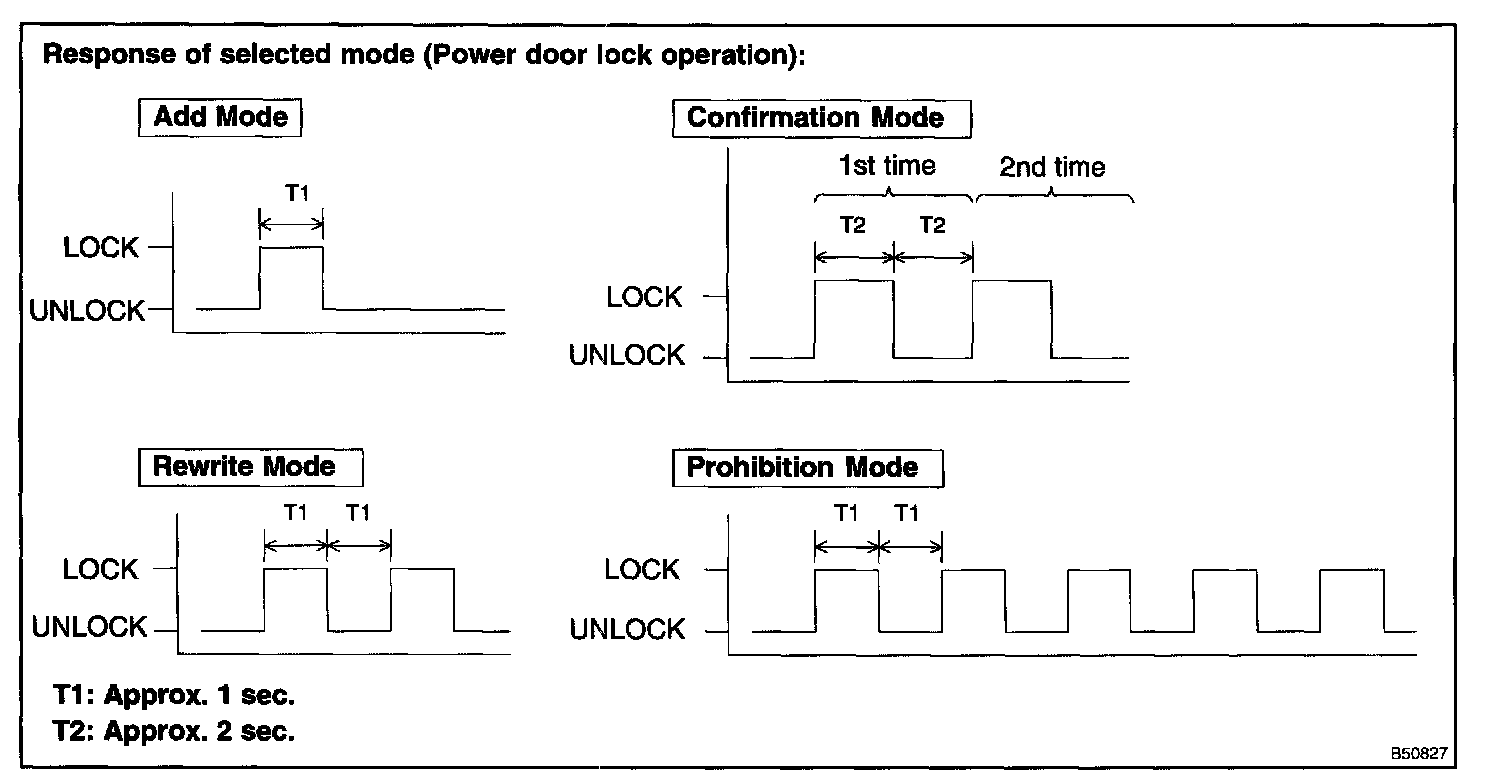 NOTE: If the number of the ON-LOCK operation of the ignition switch is 0, 4 or 6 or more, there will be no response (power door lock and unlock operation) to inform which mode has been selected.