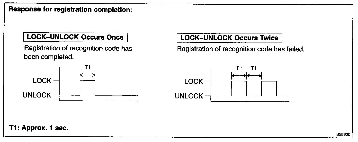 2. Within 3 seconds after the transmitter switch has been turned OFF, the LOCK-UNLOCK operation will be automatically performed once if the registration of the recognition code of the transmitter is completed correctly. In case the LOCK-UNLOCK operation is performed twice, the registration of recognition code has failed. Perform the registration procedure from the beginning once again.