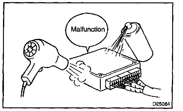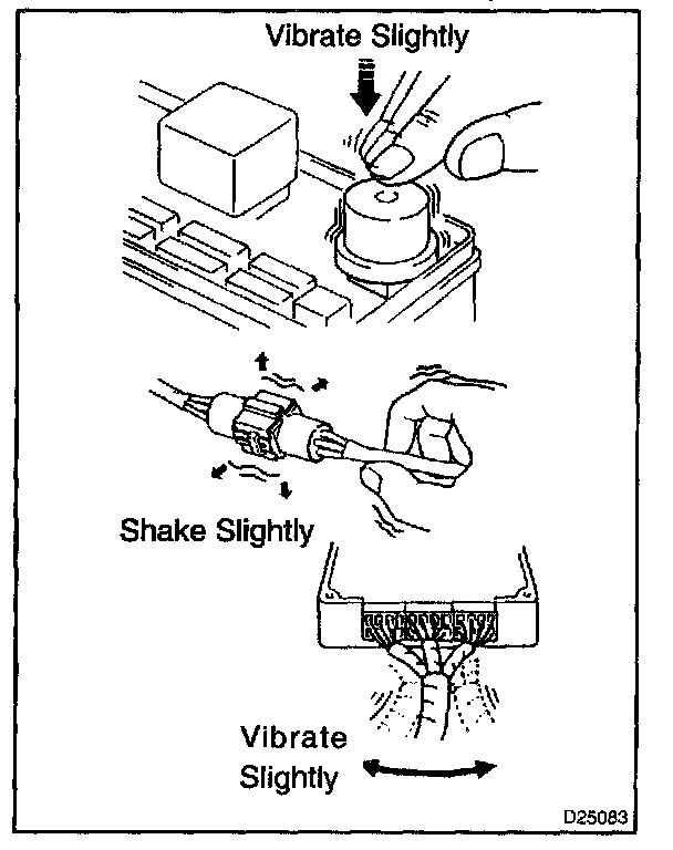 HINT: The most difficult case in troubleshooting is that no problem symptoms occurs. In such cases, a thorough customer problem analysis must be carried out. Then simulate the same or similar conditions and environment in which the problem occurred in the customer's vehicle. No matter how much experience a technician has, or how skilled he may be, if he proceeds to troubleshoot without confirming the problem symptoms, he will tend to overlook something important in the repair operation and make a wrong guess somewhere, which will only lead to a standstill. For example, for a problem which only occurs when the engine is cold, or for a problem which occurs due to vibration caused by the road during driving, etc., the problem can never be determined with the engine hot condition or the vehicle at a standstill. Since vibration, heat or water penetration (moisture) is a likely cause for the problem which is difficult to reproduce, the symptom simulation tests introduced here are effective measures in a point that the external causes are applied to the vehicle in a stationary condition.