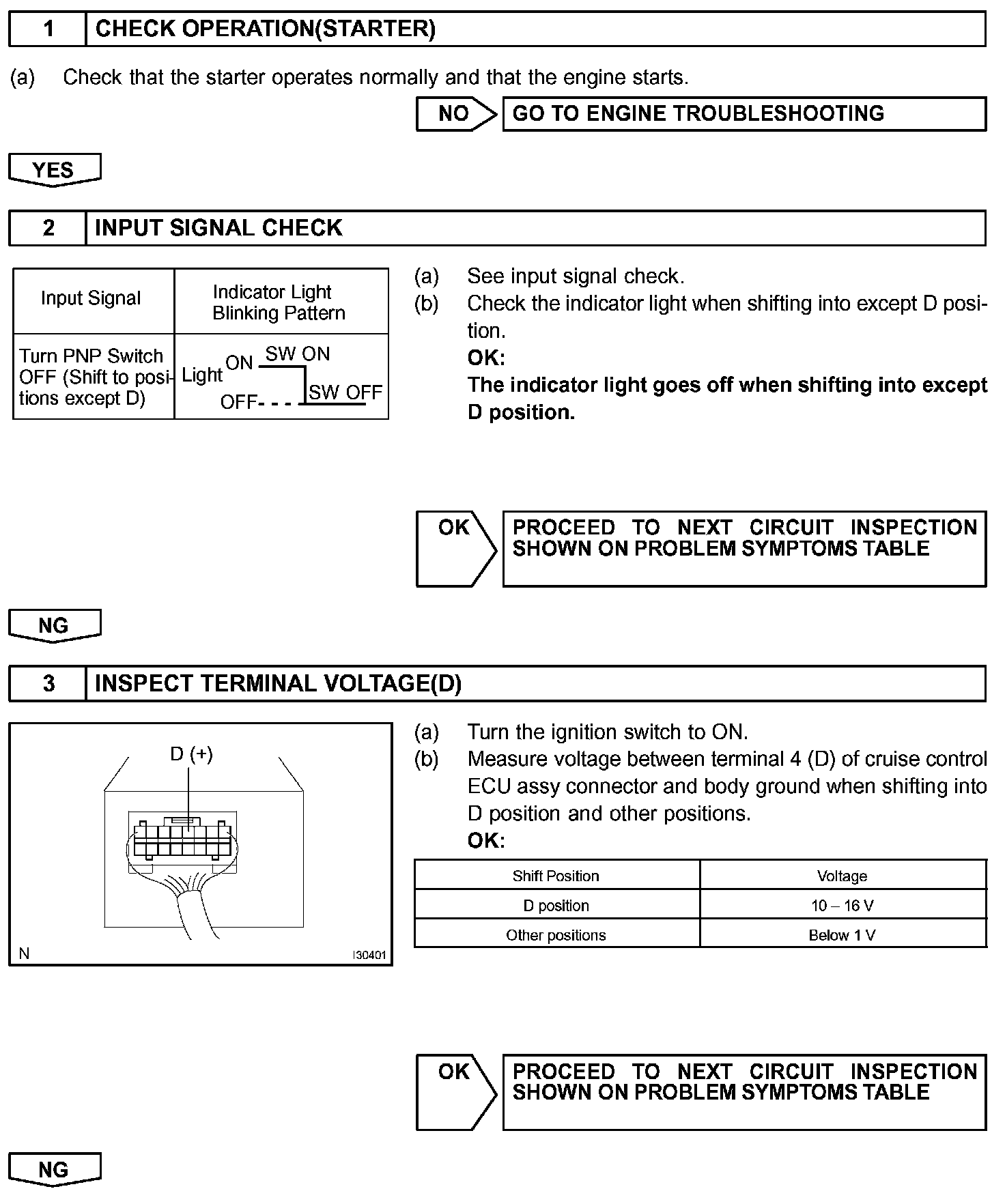 CIRCUIT DESCRIPTIONWhen the shift position is put in except D position, a signal is sent from the park/neutral position switch to the cruise control ECU assy. When this signal is input during cruise control driving, the ECU cancels the cruise control.