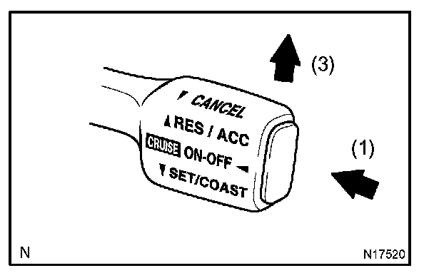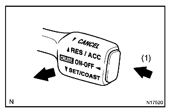 3. Check that the vehicle speed is decreases while the cruise control main switch assy is push down to SET/COAST, and the vehicle cruises at the set speed when the switch is released.