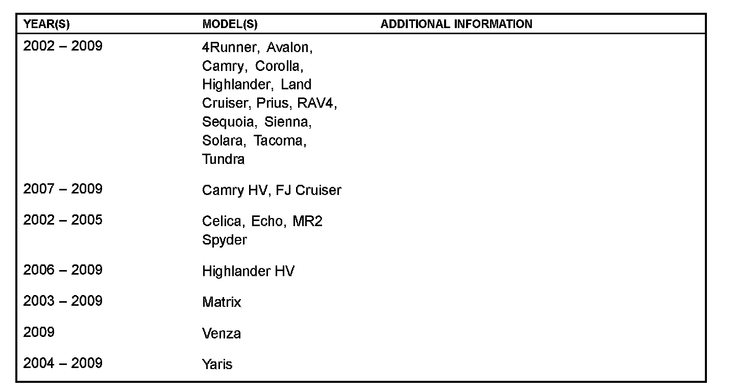 ^ 5T005-O1: Applicability has been updated to include 2008 - 2009 model year Toyota vehicles.