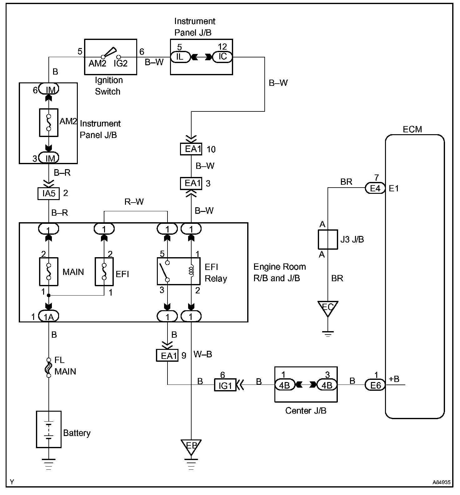 This signal causes current to flow to the coil, closing the contacts of the EFI relay and supplying power to terminal +B of the ECM.