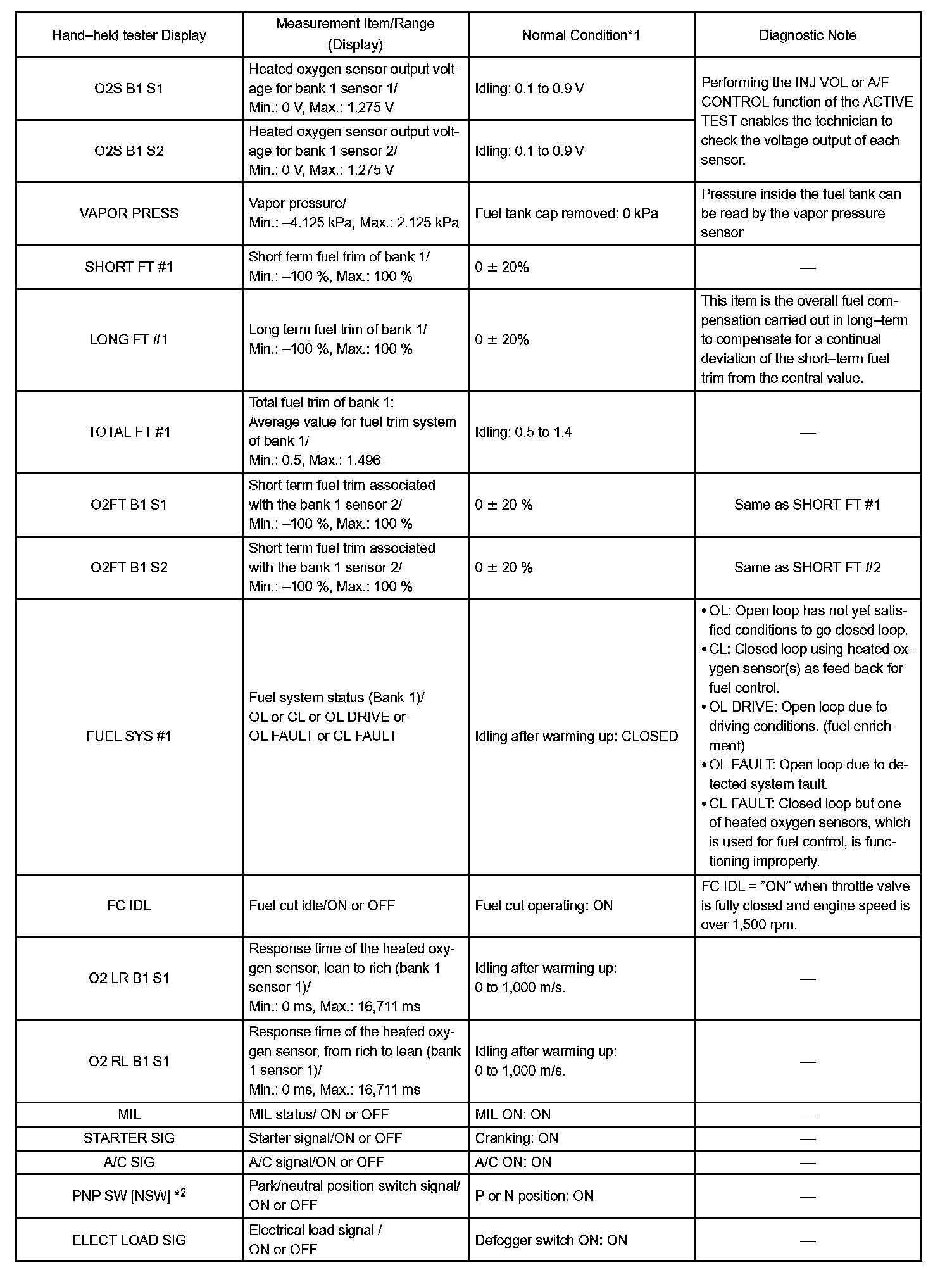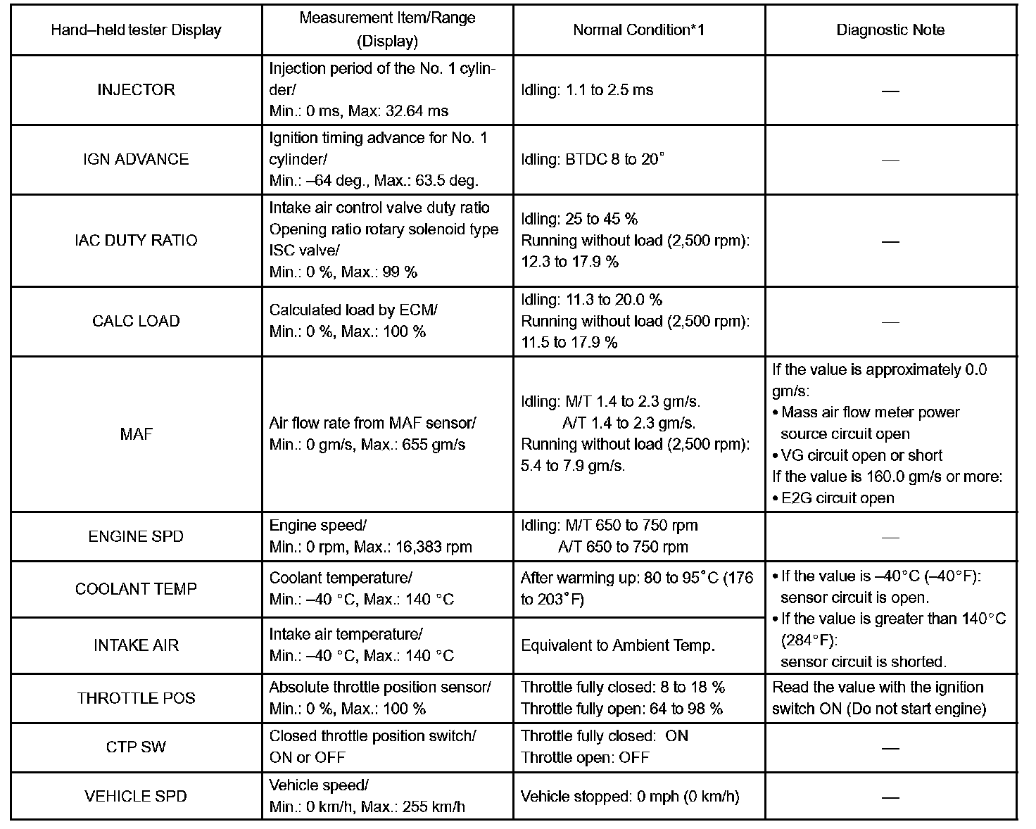 HINT: Using the DATA LIST displayed by the hand-held tester or the OBD II scan tool, you can read the value of the switches, sensors, actuators and so on without parts removal. Reading the DATA LIST as a first step of troubleshooting is one method to shorten diagnostic time.