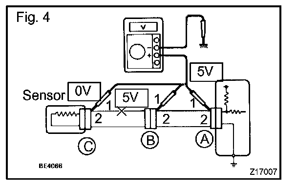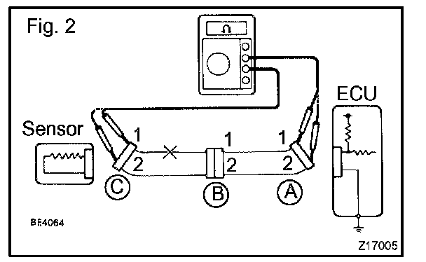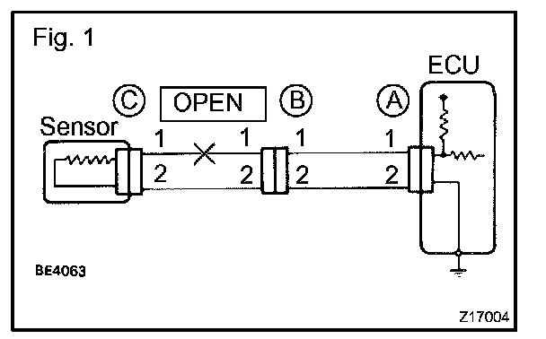 a. For an open circuit in the wire harness in Fig. 1, perform a resistance check (step b) or a voltage check (step c).