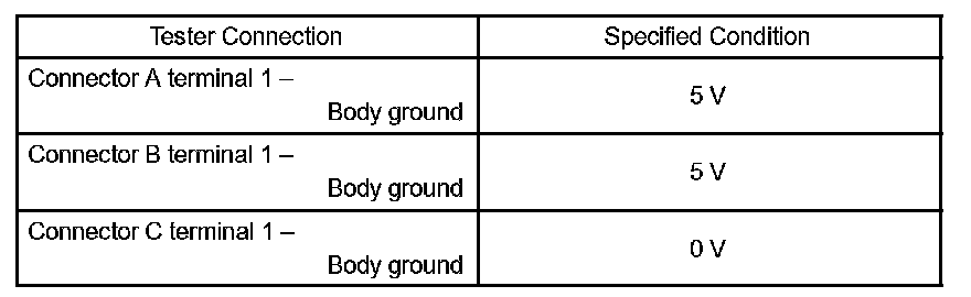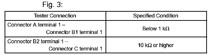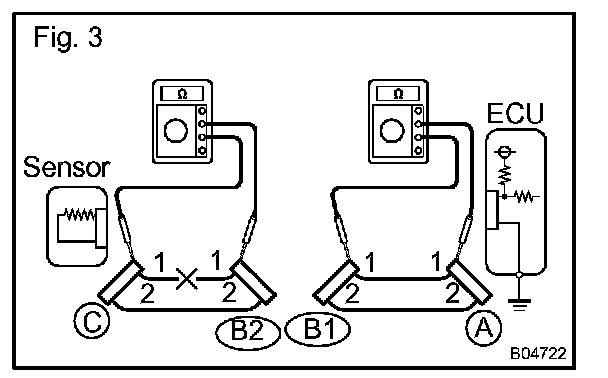 If your results match the examples above, an open circuit exists in the wire harness between terminal 1 of B and terminal 1 of C.