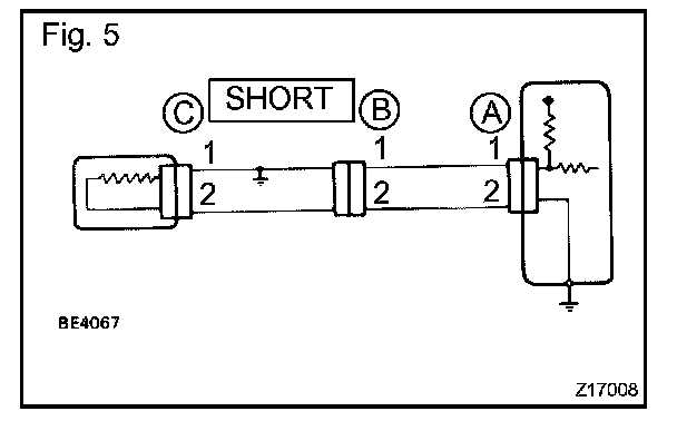 a. If the wire harness is ground shorted (Fig. 5), locate the section by conducting a resistance check with the body ground.