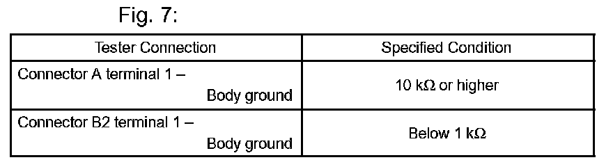 2. Disconnect connector B and measure the resistance between terminal 1 of connector A and the body ground, and terminal 1 of connector B2 and the body ground.