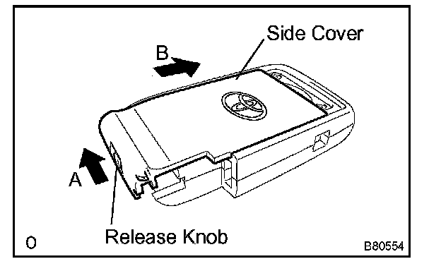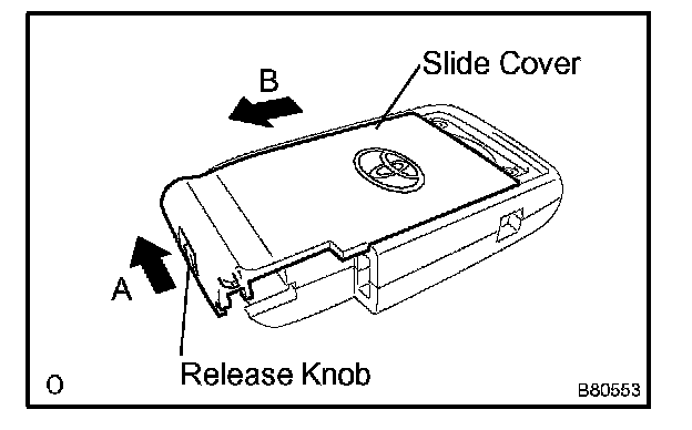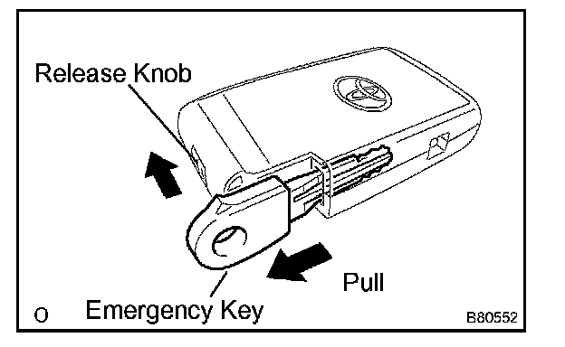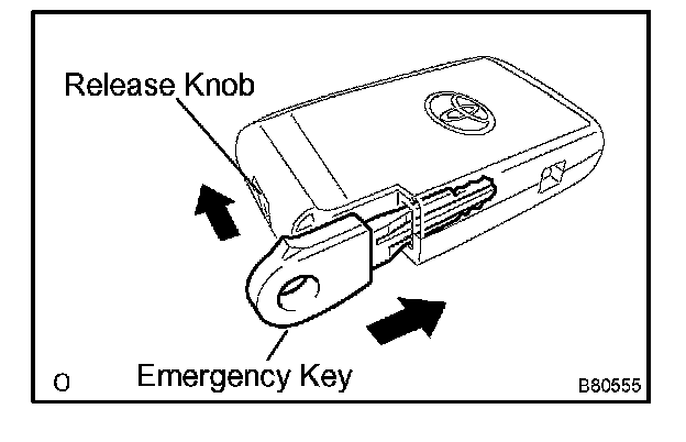 a. Push and hold the release knob in the direction indicated by the arrow in the illustration. Take the emergency key out of the key.
