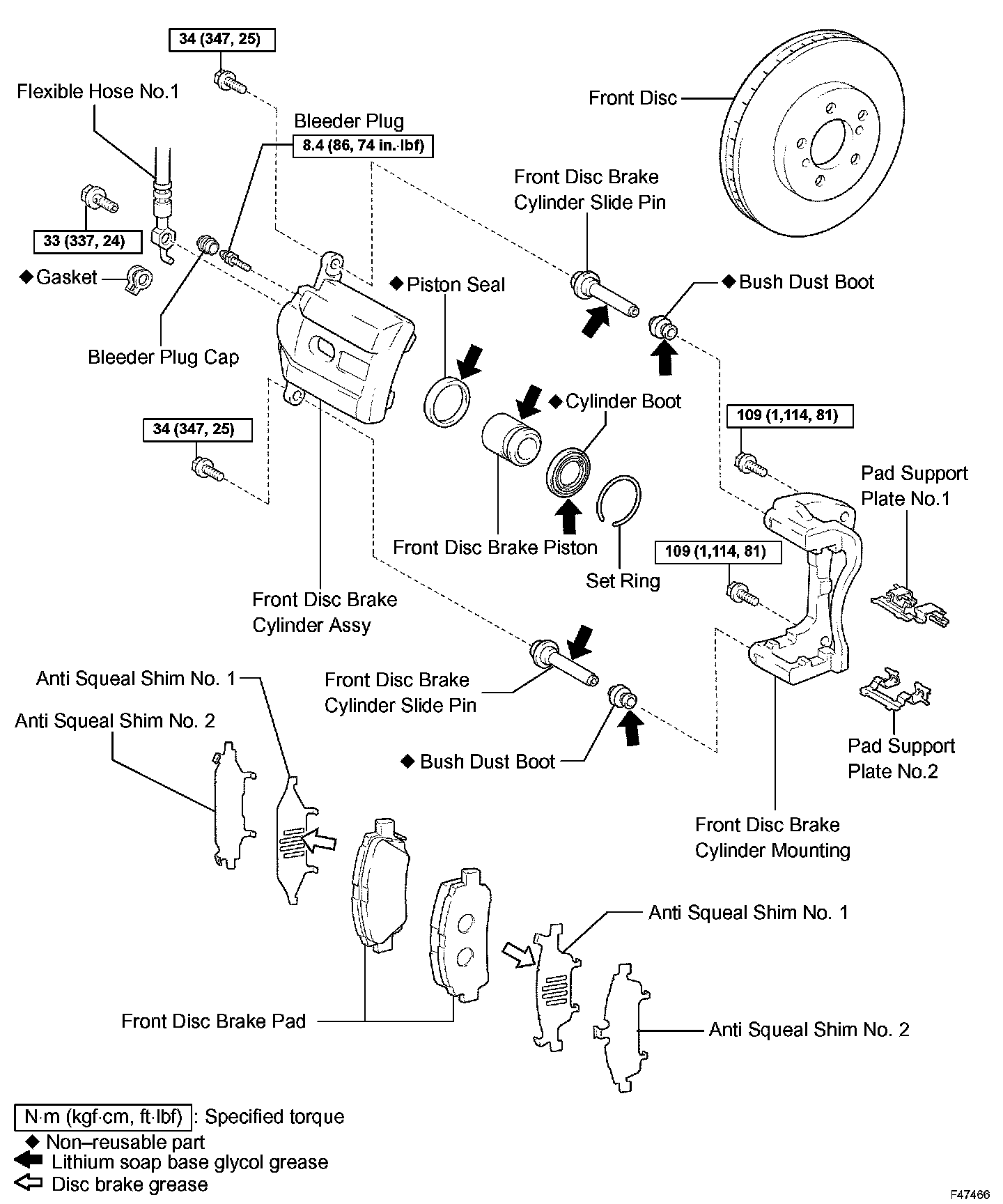 a) Apply disc brake grease to the area where the anti squeal shim No.1 makes contact.
