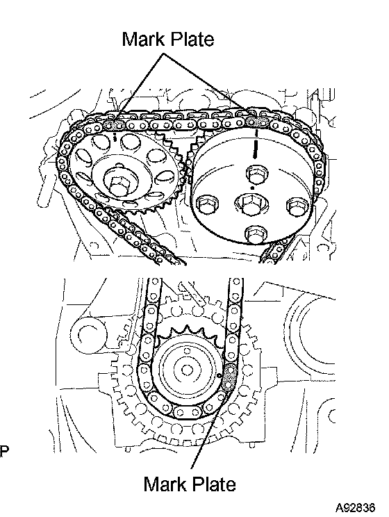 b. Install the chain so the timing mark and the mark plate of the chain are aligned.