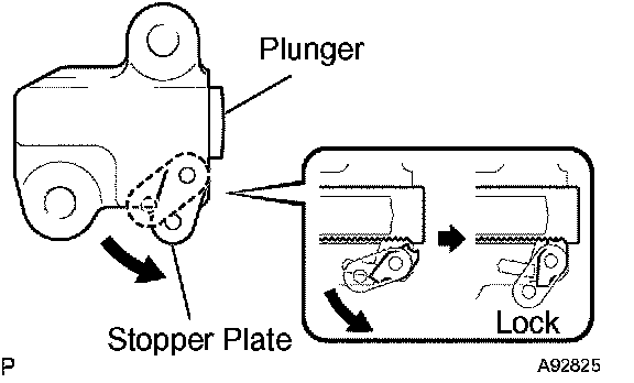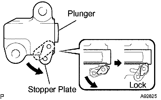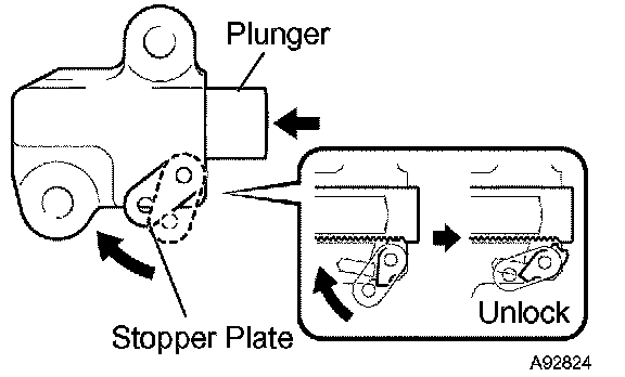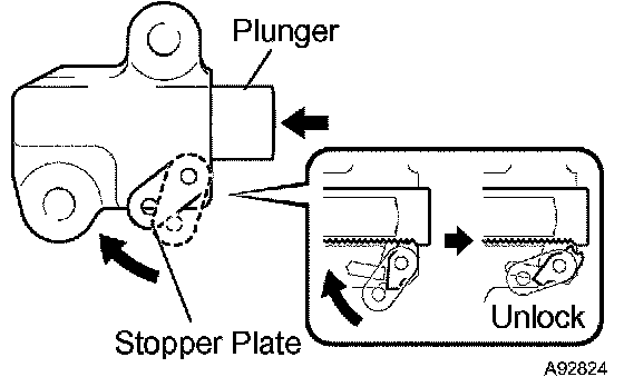 HINT: If the stopper plate is not completely lifted down and a 3.0 mm (0.118 inch) diameter bar cannot be inserted, unlock and pull out the plunger slightly. The stopper plate will be completely lifted down and a 3.0 mm (0.118 inch) diameter bar can be inserted easily.