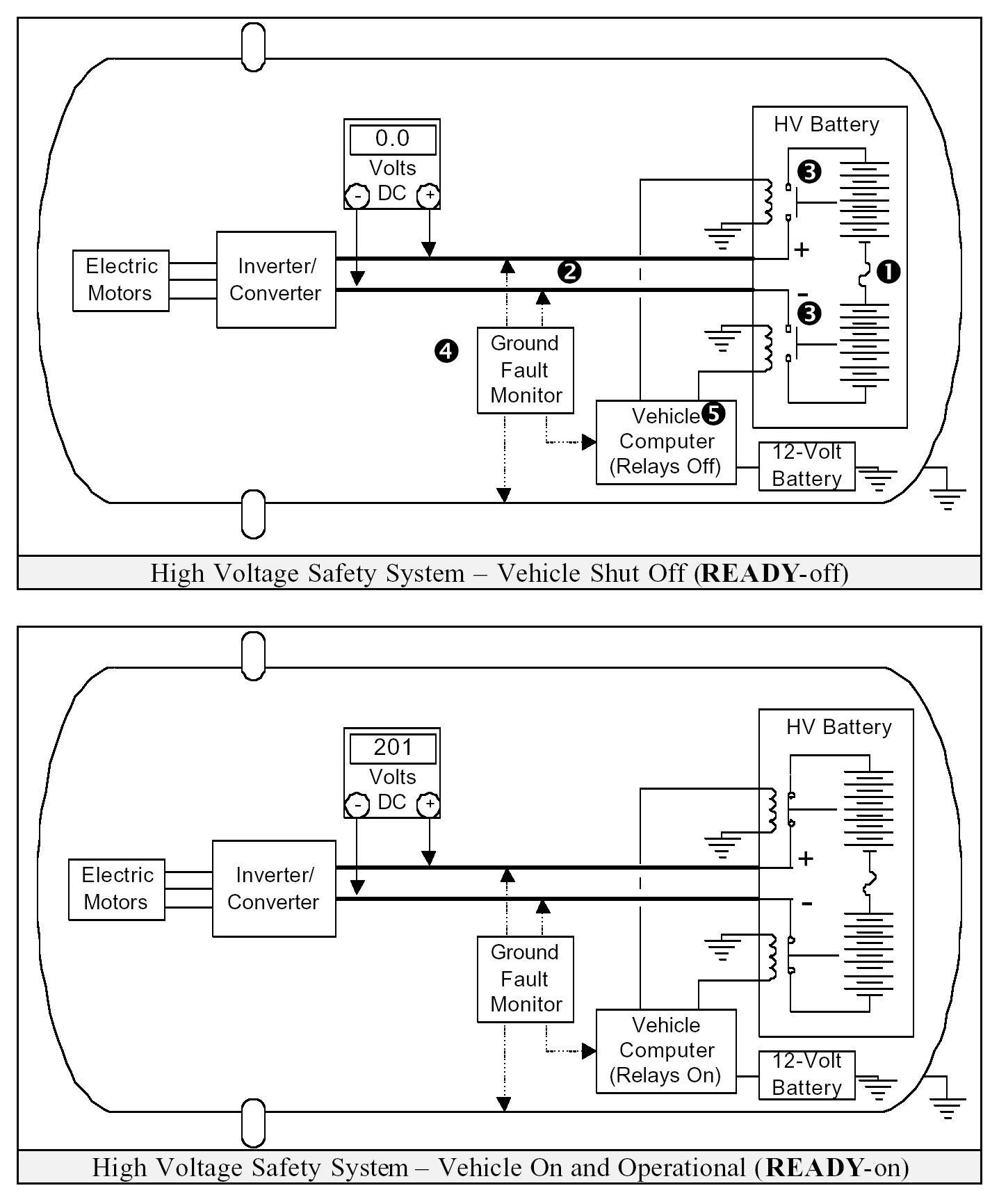- Positive and negative high voltage power cables "2" connected to the HV battery pack are controlled by 12-Volt normally open relays "3". When the vehicle is shut off, the relays stop electricity flow from the HV battery pack.