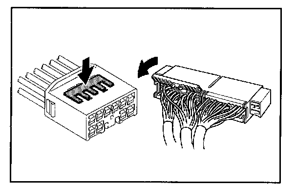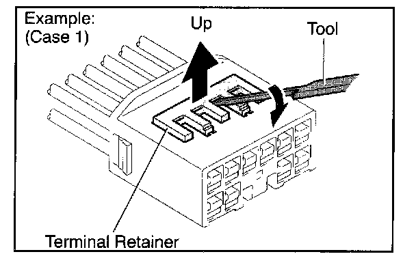 Insert the special tool into the terminal retainer access hole ([]Mark) and pull the terminal retainer up to the temporary lock position.