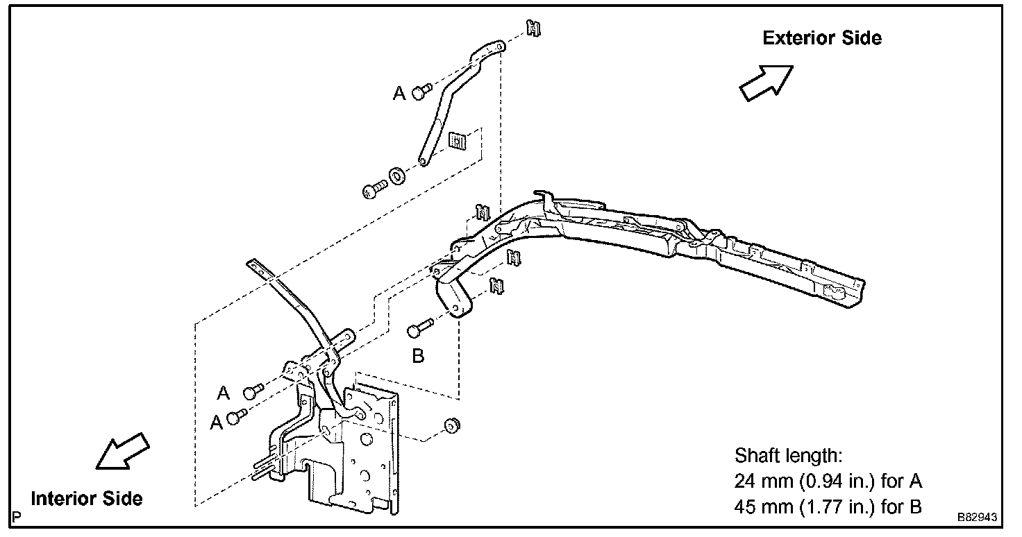 . Install the 3 shafts (length A: 24 mm (0.94 in.); length B: 45 mm (1.77 in.)) to the tarpaulin rails. Then connect the 3 clips into the grooves of the 3 shafts.