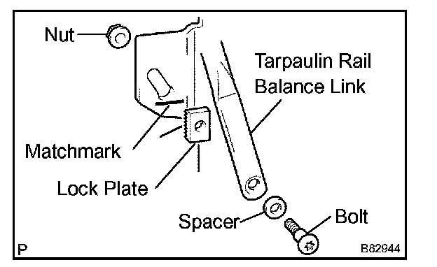 3. Using a torx wrench (T40), install the bolt, spacer, lock plate and nut to the tarpaulin pivot bracket.