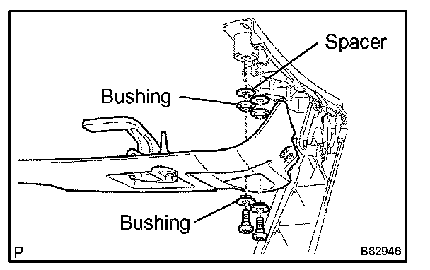 a. Using a torx wrench (T40), install the 2 spacers and 4 bushings, and partially tightening the 2 bolts to the No.1 bow as shown in the illustration.