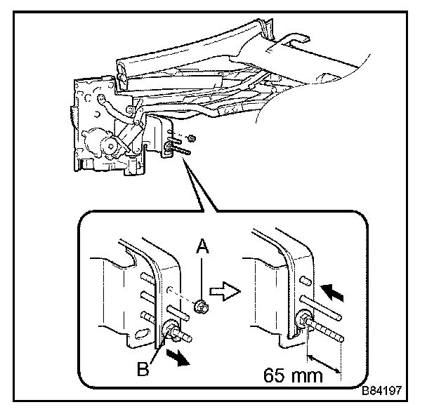 c. On the rear rail bow bracket, uniformly loosen nuts A and B. Then remove nut A.