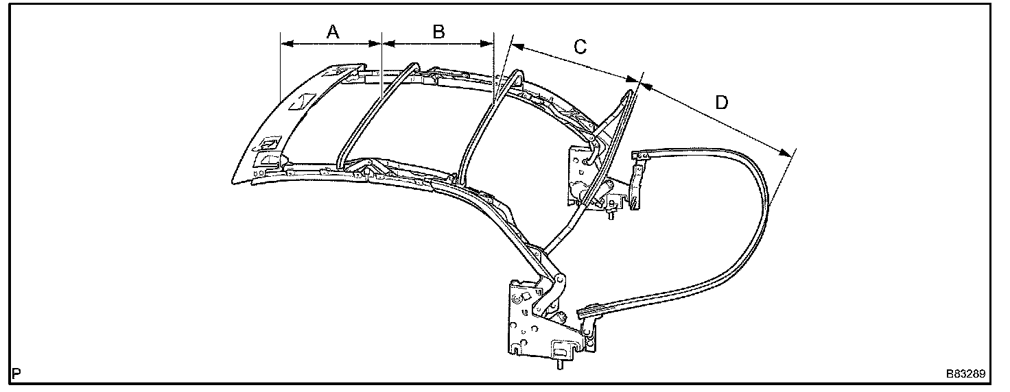 j. Check the alignment of the tarpaulin rail's parts by taking the measurements indicated in A, B, C, and D in the illustration. Check that the measurements are within the standard values.