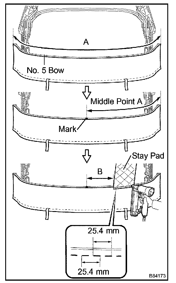 d. Using a staple gun, staple the stay pad to the No.2, No.3 and No.4 bows, as shown in the illustration.