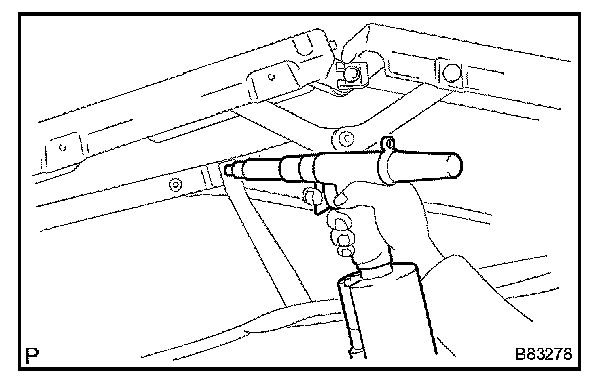 i. Using an air riveter equipped with a nose piece, install the P clip and the rear rail with the rivet.