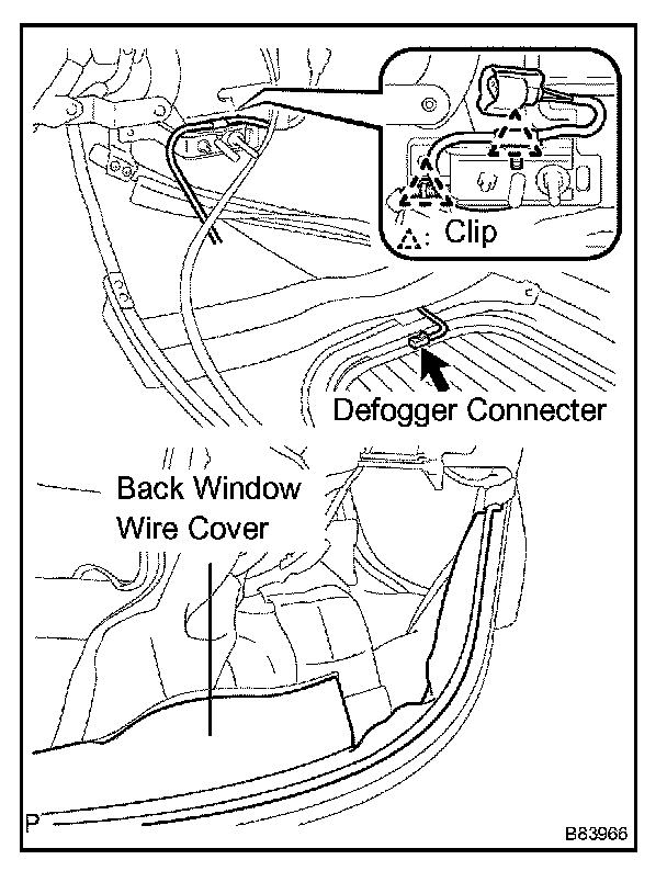 b. Connect the defogger wire's 2 clips to the tarpaulin rail pivot bracket. Also connect the 2 connectors to the rear window.