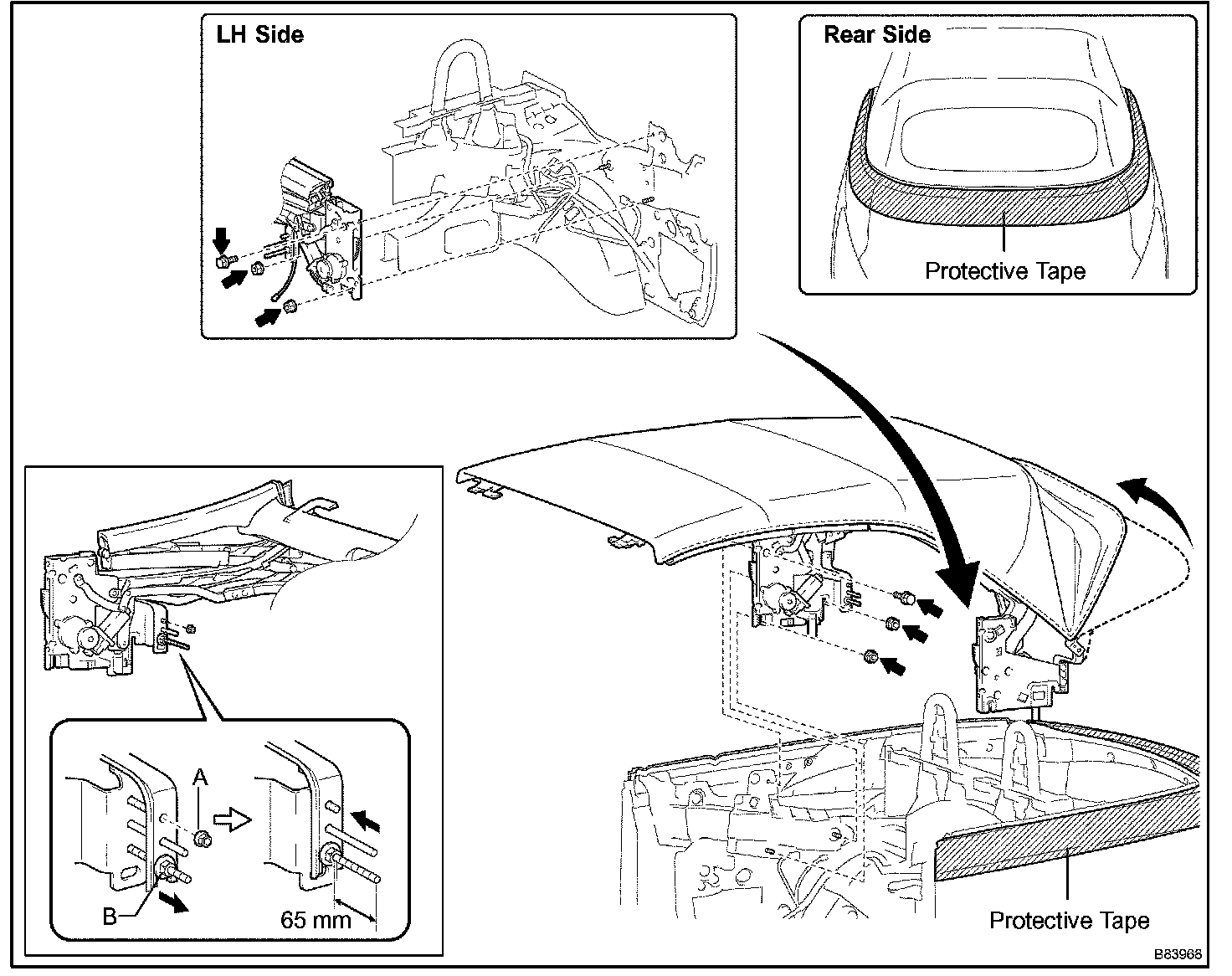 o. Using a 6 mm hexagon wrench, install the convertible roof motor with the 3 bolts.