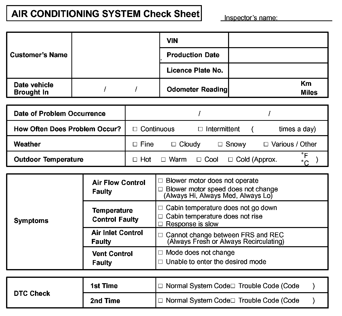 Air Conditioning System Check Sheet: