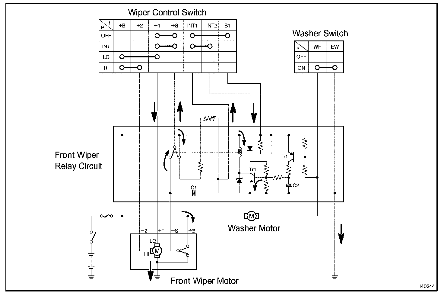 b. If the wiper control switch is turned to the INT position, current flows from the already charged capacitor C1 through terminals INT1 and INT2 of the wiper control switch, to Tr1 (transistor). When Tr1 turns on, current flows from terminal +S of the wiper control switch to terminal +1 of the wiper control switch, to terminal +1 of the wiper motor, to the wiper motor and finally to the ground, causing the wiper motor to operate. At the same time, current flows from capacitor C1 to terminal INT1 of the wiper control switch and then INT2. When the current flow from capacitor C1 ends, Tr1 turns off to stop the relay contact point and halt the wiper motor.