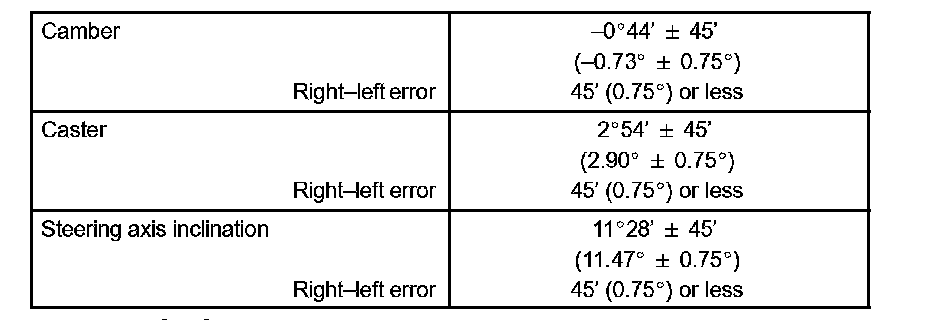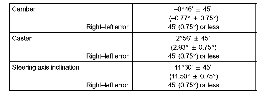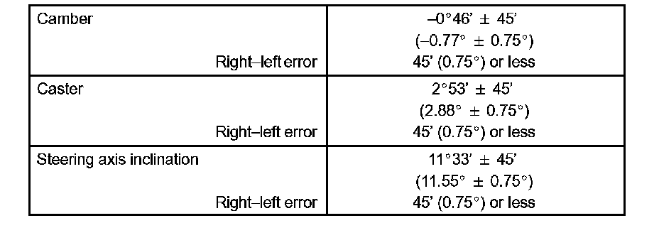 Check the suspension parts for damaged and/or worn out parts if the caster and steering axis inclination are not within the specified range after the camber has been correctly adjusted.